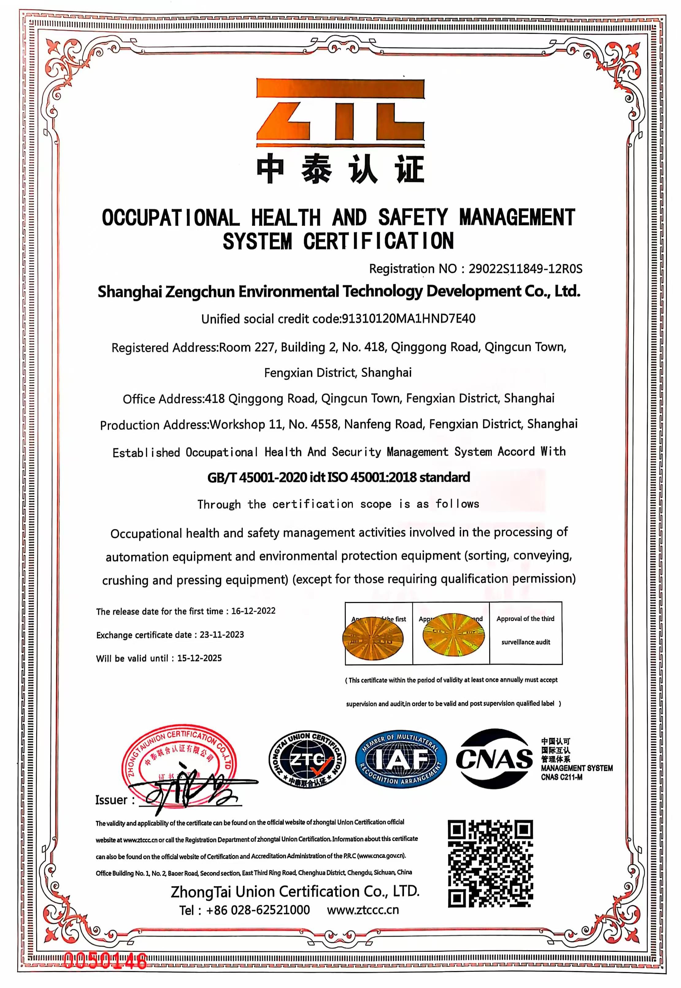 环境管理体系认证证书
